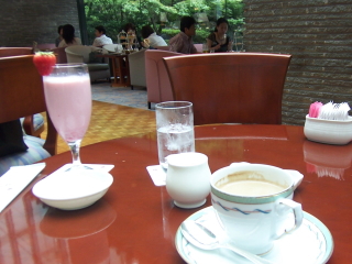 というわけで、今日は山田真哉さんとラウンジで簡単な打ち合わせ。何なんですか、そのえらくかわいらしい飲み物は。