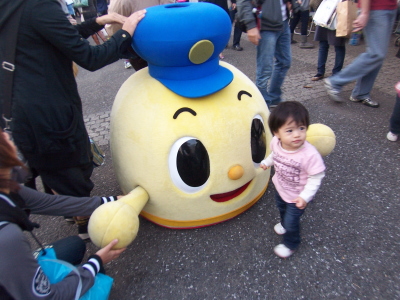 子供たちに一番人気だったのが、このゆるキャラ。多分、平成筑豊鉄道の「ちくまる」くん。普段は足があるんですけど、突然しゃがみこんで足が消えて地べたにドスン。子供たちと同じ目線になるのです。そう言えば、ゆるキャラってかわいいけど、子供にとっては大きな着ぐるみばかりですよね…。これいいなあ。