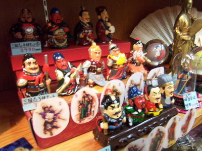 中華街の中のお店にて。お、2列目は「三国志」の蜀の五虎将(関羽・張飛・趙雲・馬超・黄忠)の置き物だ。初めて見た。ところで、どうして神戸の中華街に行ったのかという理由は、また後日にTimestage Blogにでも書きます。