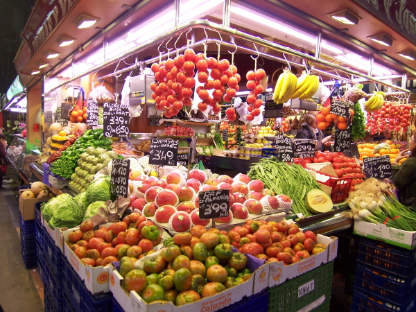 コロンブスの塔から、にぎやかなランブラス通りを歩いているとボケリーア市場があります。海外に行くと必ず市場に行くようにしているのですが、ヨーロッパは野菜や果物の並べ方がなんとなくステキ。