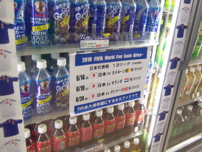 コンビニの飲料コーナーにて。サッカーワールドカップの日本戦の日程が書かれてあります。