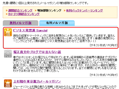 ビジネス発想源10月2日創刊予定の『ビジネス発想源 Special』、先週の「まぐまぐプレミアム」の「増加部数ランキング」にて先々週に引き続き2週連続で、第1位を獲得していたそうです。ありがとうございます。純粋に嬉しいです。