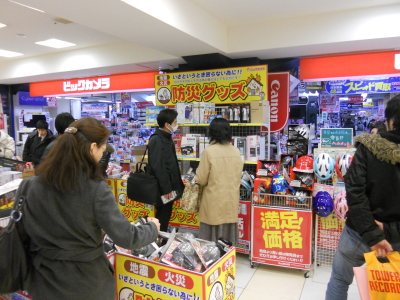 これから代々木で始まる「発想源ライブプレミアム」に必要な機材を購入するために新宿のビッグカメラに寄ったら、防災グッズコーナーができていて、人が集まっていました。確かに便利そうなモノがいろいろと。安全ヘルメットの代わりに自転車競技用のヘルメットが売ってたりしました。品物の便乗値上げはダメですが、こうやって「この品物も代用できますよ」という売り方はとってもアリだと思います。