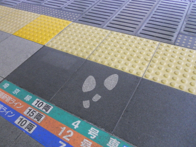 足跡 日常の発想源 2011.04.15 Tweet 駅のホームで「ここに並んで下さいね」という印であることは分かるのですが、実際にこの上にこの通りに立ってみると、かなり不自然なモデル立ちになりました。どうしてこの形を採用したんだろ? Tweet
