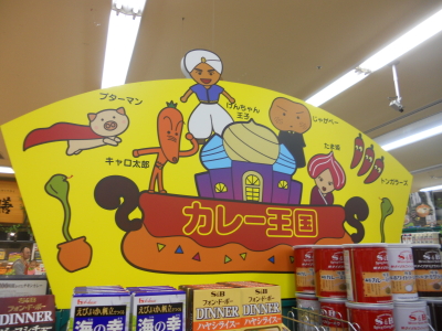カレーが大好きなのですが、あるスーパーでカレー粉のコーナーに「カレー王国」なるPOPが掲げられていました。けんちゃん王子を中心に、玉ねぎのたま姫、ジャガイモのじゃがべー、ニンジンのキャロ太郎、豚肉のブターマン、唐辛子のトンガラーズとなかなかキャラ設定もしっかりしていて、モスク風の建物や蛇の壺など、世界観もばっちり。