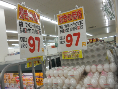 他の店ではなんと卵1パック97円で売られてました!POPにも堂々と「競合店に対抗して値下げしました」と書かれてあり、対抗意識メラメラです。
