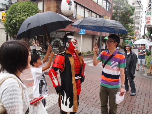 「セッシャー1、からくりなんだから雨に打たれたらショートしちゃうじゃん!」と、雨天の中で傘を差しだすファンの皆さん。ファンの皆さんもきちんとドラマの中の設定を理解してその世界観の中にいます。楽しそう。そしてセッシャー1の後ろを、ファンがぞろぞろついていきます。すげー!