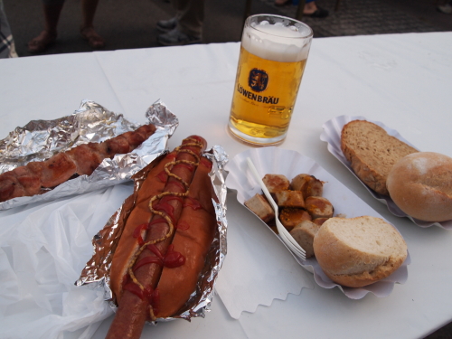 ドイツのビール・レーベンブロイに、カレーヴォーストやらポークドッグやドイツのパンなど、ドイツ料理の屋台モノをいろいろ揃えて食べました。いやあ美味しかった。近いうちにドイツに行きたいなと思っているので、いろいろと勉強になりました。