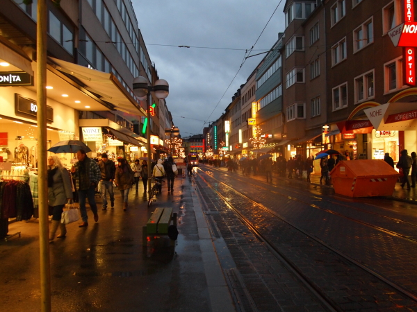 ヴュルツブルク中央駅から市街地へ延びるカイザー通り(Kaiser str.)。中央駅に着いた頃にはもう既に夕方で、しかも冷たい雨が降り始めました。昨日まで晴天が多くて「ドイツも意外に暖かいな」とたかをくくっていたのですが、あまりの寒さに身体がかじかんでしまいました。カイザー通りには多数の店が並んでいますが、300円ショップみたいな雑貨屋さんで、傘とマフラーを購入することに。