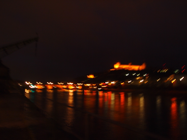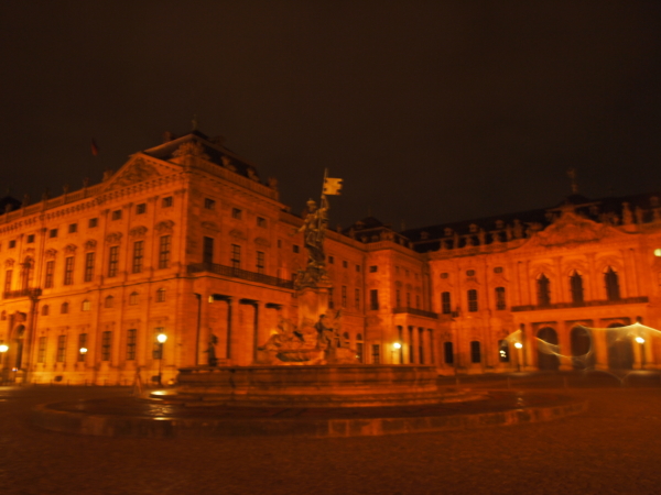 ヴュルツブルクのハイライトの一つである、マイン川の対岸にそびえる要塞・マリエンベルク城を見に来たのですが、あまりの暗さに私のカメラではキレイに写すことができませんでした…。というのも、雨も風も強くなってきて、買った傘がぶっ壊れるぐらいで、三脚を使っても倒れてしまうほどなのです。三脚持ってきてないけど。でも、アルテ・マイン橋とマリエンベルク城のライトアップは、それはもうほんとにキレイでした。今度は昼に来たいな。