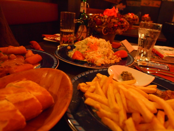 あまりに寒かったので、ユリウス通りのお店に入ってポークステーキなどを食べることに。アメリカンスタイルの店なのか、サラダもポテトも山盛りでやって来ました。店名は忘れたけど、この店はサービスも良くて美味しかったなー。各テーブルのキャンドルもいい感じでした。