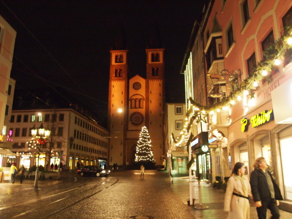 市庁舎横のマルクト広場でにぎわっているクリスマスマーケットを抜けて、アルテ・マイン橋から延びる大聖堂通りへ。目の前に聖キリアン大聖堂が建っています。大聖堂の横にはノイミュンスター教会という教会もあり観光スポットの一つになっています。