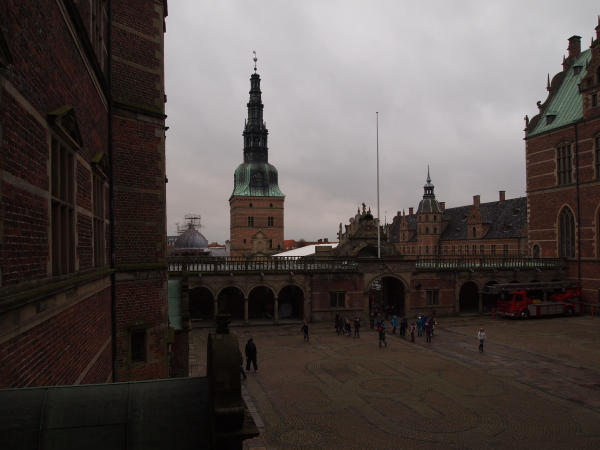 北欧の名城・フレデリクスボー城の城内を散策中です。城内の窓から見た中庭。今はオフシーズンで人もまばらに見えますが、夏ごろはとてもたくさんの人が訪れるそうです。なぜか消防車が停まってますね。