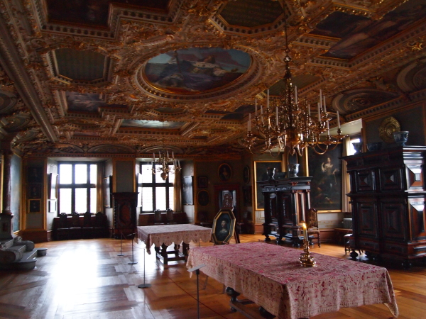 食堂…なんでしょうか。天井の壁画と装飾が見事です。こういう部屋が、いくつもあるのですよ。飾られている調度品も一つ一つが芸術品のようです。ちなみに城内は、フラッシュさえ焚かなければ写真撮影はOKなんだとか。