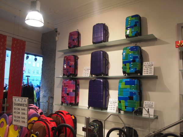 ドイツ、デンマークでそれぞれお土産を大量に買い込んでしまい、そろそろ荷物に余裕が無くなってきたな…ということで、かばん屋さんに入ってキャリーバッグを1つ購入することに。日本では単色のものが多いですが、北欧のキャリーバックは色とりどりでカラフルなデザインなものが多いです。