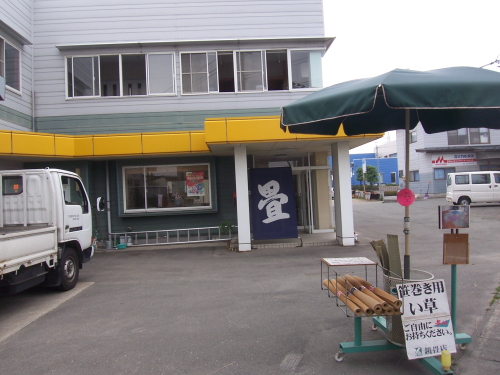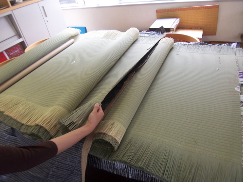 鏡畳店のショールームで実際に触らせてもらった、いわゆる「畳表」。こうやって並べて触ってみると、国産畳と中国産畳、高級畳と低級畳の違いって、もう一発で分かります。普通は家を建てる時などは、良心的な業者でも手のひらサイズぐらいの四辺の畳を触らせて選ばせたりしますが、鏡社長は必ずこのように畳表の状態で持っていって検討して頂くんだそうです。そうしないと、本当の感触が分かんないんですね。