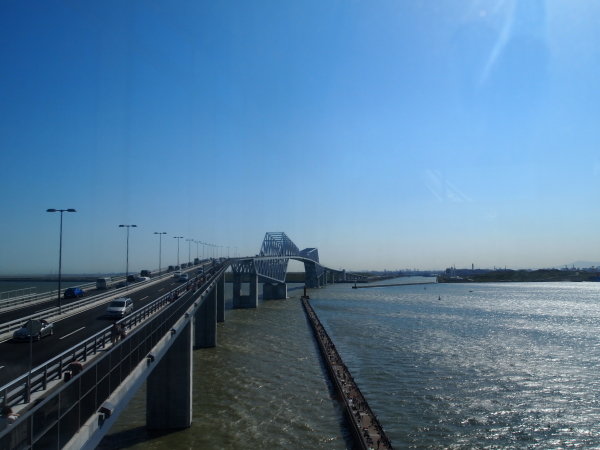 羽田空港が近いですから、飛行機が急接近します。大きな機体とゲートブリッジを1つの写真に収めるためにカメラを向けている人がたくさんいました。開通してからは、ゲートブリッジはライティングされて遠くからでもその様子が東京湾に浮かびあがります。東京スカイツリーと共に新たな東京のランドマークとなったゲートブリッジ。今度は車で通ってみよう。