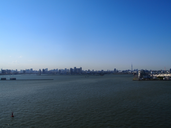 ゲートブリッジから見た都心部。最も手前に見えるビル群は、江東区の東雲や豊洲のマンション群。右手側には東京スカイツリーが見えますね。ゲートブリッジの歩道は北側、つまり東京都心側の片側のみとなっていて、若洲側からはエレベーターで昇れるけれども、対岸の中央防波堤側には降りることができず引き返さなければなりません。でも、素晴らしい眺めなので一度は行く価値はあるかと。