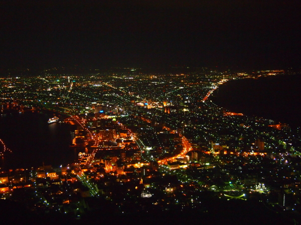 夜は函館山に登り、函館のシンボルとも言える夜景を見ました。美しいー。一般的に函館山というのはいくつかの山の総称であり、展望台があるのは函館山の中の御殿山。その展望台へはロープウェイで行けますが、函館駅から直通でバスが出ていたのでそれに乗ることに。バスガイドさんが眺望スポットなどの説明をしてくれます。それにしても、何と美しいんでしょう。