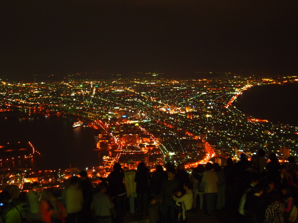 観光のオフシーズンとは言え、この時間帯は展望台はたくさんの観光客であふれていました。こうやって観光客を背景に夜景をみると、いっそうCGのように幻想的に見えますね…。山頂は標高334mだそうですが、この山麓との距離の近さがこの美しさをより鮮明に押し出しているようです。