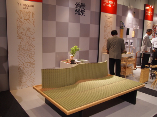 そして海外の多くのバイヤーたちから大注目を集めていたのが、この新タイプの畳敷きのベッドとベンチ。カタログには「いぐさロール」と書いてありましたが、短いい草を束状にしたものを並べているもの。しかも従来の畳と同じように、張り替えるのも可能なんだそうですよ。い草の感触と同時にその突起が肌に気持ち良くて、外国人がみんな座ったりなでたりしていました。中には、海外で絶大な人気を誇るテレビ司会者の方もいらしていたんだとか。これは欲しいなあ…。そのデザイン性といい機能性といい、ばんばん海外に売れて行きそうな予感がします。