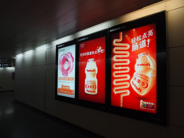 至るところにある、ヤクルトの看板。ヤクルトは中国ではかなりメジャーな飲み物らしいですね。この腸の形の広告が印象的。