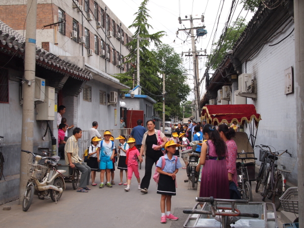 歩いているうちに迷い込んでいた胡同(フートン)の中に小学校があって、校門前には保護者達の行列が。中国では過酷な受験戦争が繰り広げられているそうですが、そんな教育熱よりも先に、日本では考えられないほど誘拐犯罪が多いとか。それは一人っ子政策で貴重な子どもを人質にするという身代金狙いではなく、むしろ奴隷や売春婦としての労働力として人身売買されているんだとか。だから学校の前には迎えの親が必ず来るんですね。
