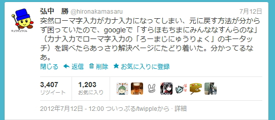 昨日、PCで作業をしていたら突然いつものローマ字入力がカナ入力になってしまい、カナ配列を全然知らないので、どうやって直すのか分からずめちゃくちゃ焦りました。とっさにgoogleに手を伸ばすも、検索語入力できんやん!ということで、そのまま「すらほもちまにみんななすんらのな」(「ろーまじにゅうりょく」のカナ入力)と打ったところ、解決方法のサイトがササッと出てきたんですね。そして解決方法が一発で。おー。すごい。