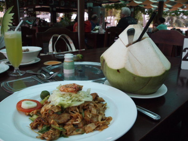 プールサイドのレストランで簡単にお昼ごはん。おなじみ、ココナッツジュースに、インドネシア風焼きそばみたいな食べ物。ちなみにリゾートの敷地内はインドネシアルピアではなくシンガポールドルが流通しているため両替は必要ありませんでした。だいたいの飲食店ではクレジットカードが使えます。