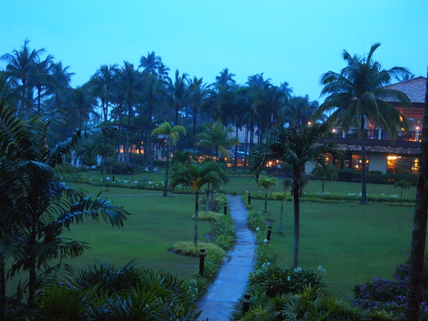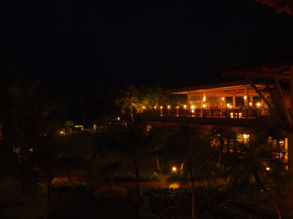 夜になりました。日本では9月というと秋ですが、赤道にとても近いここでは常夏。夜でも真夏の格好で十分です。夜は抑え気味の灯りなので、とてもロマンティックに見えます。