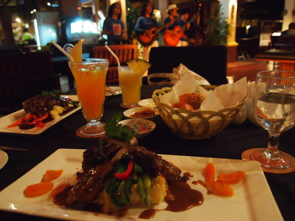 夜はステーキっぽいディナーを食べました。ギターなどのカルテットがライブ演奏を始めたのですが、比較的おとなしめの曲と、バルコニーの雨音がとてもいい感じで、まったりと過ごすことができました。それにしても、お肉はもちろんですが、焼きたてのパンが美味しかった。
