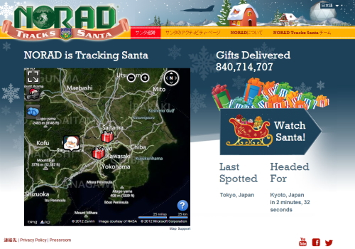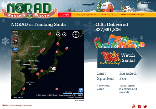 毎年恒例となっている、サンタさんの現在位置を教えてくれる「NORAD TRACKS SANTA」。