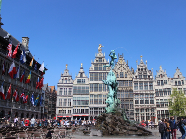 マルクト広場。左手に見える国旗がたくさん掲げられた建物がアントワープ市庁舎です。