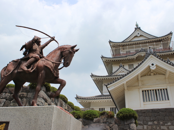 千葉城前に建つ「飛躍」と題名がついた騎馬武者像。