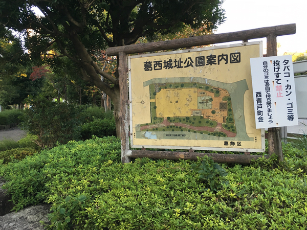 場所は葛飾区青戸。環七通り(都道318号線)沿いに、まさに葛西城址公園という名の公園があります。もともと中川の流れを守りに利用した平城で、現在では埋め立てや環七通りの開通によって遺構は全く残っておらず、公園の名にその名を残すのみです。